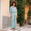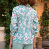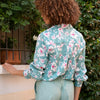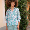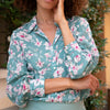 This shirt is made of cotton voile and fastens with six mother-of-pearl buttons. The sleeves are long, and the cuffs are finished with four mother-of-pearl buttons. It has a relaxed, loose fit over trousers or a plain skirt. Length 65 cm in size S. Machine wash at 30 degrees