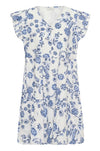 Short floral dress with soft texture, loose fit, and tiered silhouette. Features a V-neckline and ruffled short sleeves for a feminine edge.