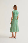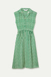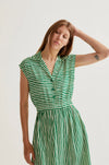 Lavagna green print midi dress. Lapel collar and sleeveless. Front button closure in green. Elasticated waist. Side pockets. The model is 177 cm tall and wears size S.
