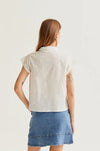 White shirt made from 100% cotton. Features a lapel collar, short sleeves, and a white button-front closure. Embroidered floral details are also included. The model is 177 cm tall and wears a size S.